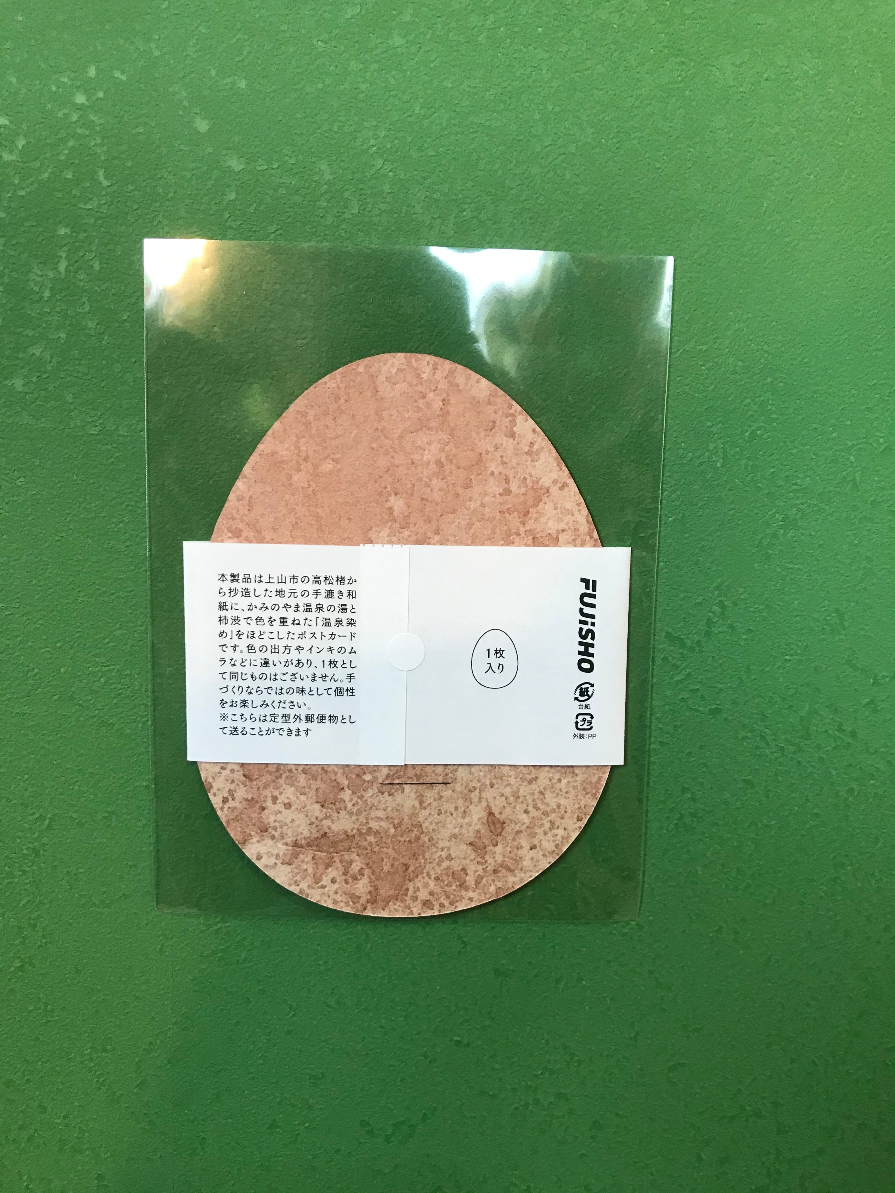 上山市の手漉き和紙に上山温泉の湯と柿渋で染めた「温泉染め」をほどこした温泉たまご型のminiポストカードです。